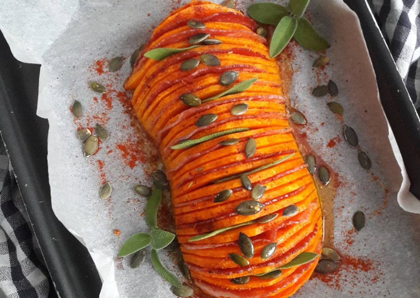 - Ensuite insérer, entre les lamelles, de la pancetta ou autre et des feuilles de sauge (ou ce que vous voulez) assaisonnez avec du paprika fumé, salez et poivrez. Ajoutez des graines de courges ou autre qui donneront du croustillant. Cuire au four 15 mn.