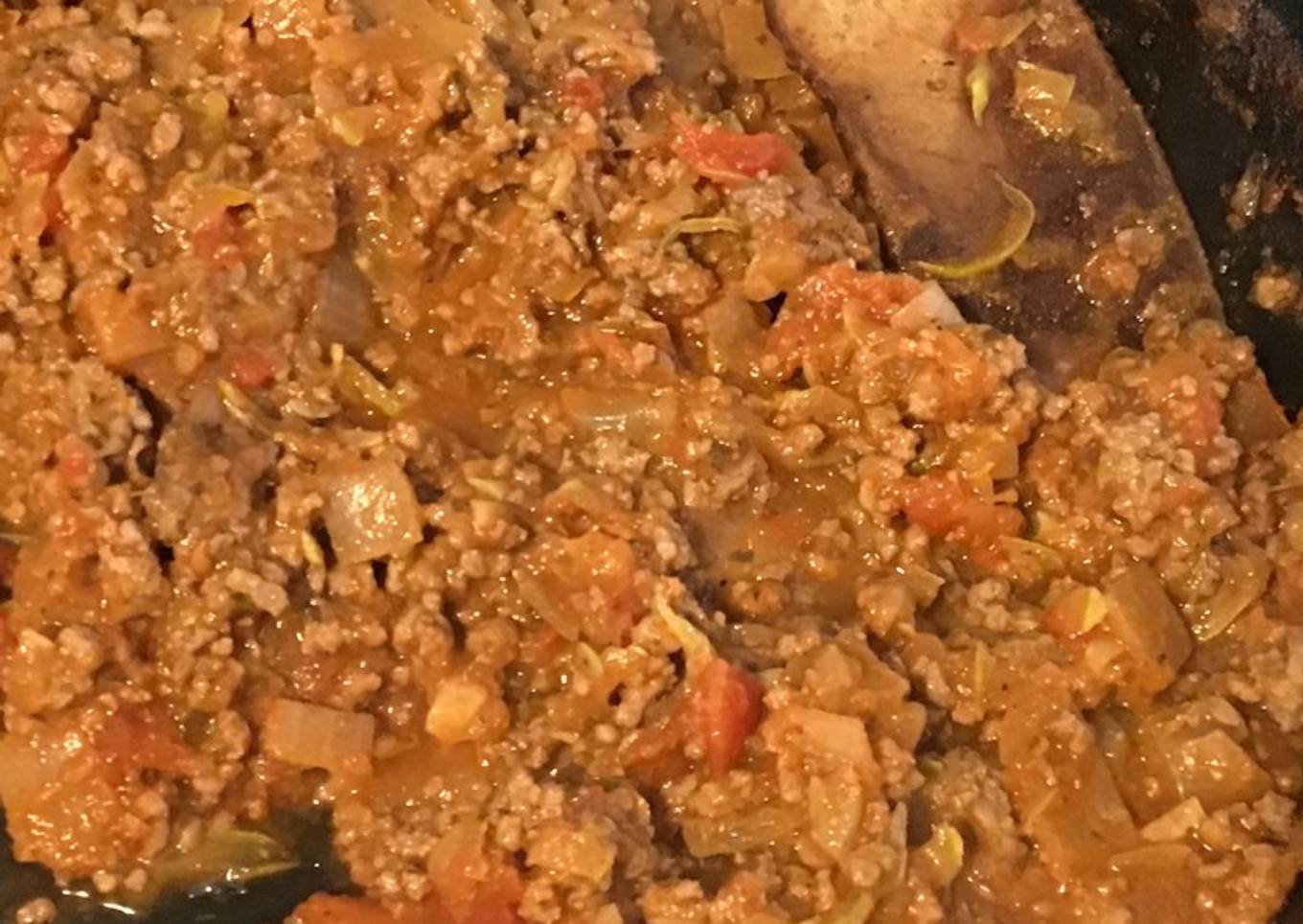 Farce/sauce au bœuf, courgette, tomates et oignon au bouillon de courge et cumin
