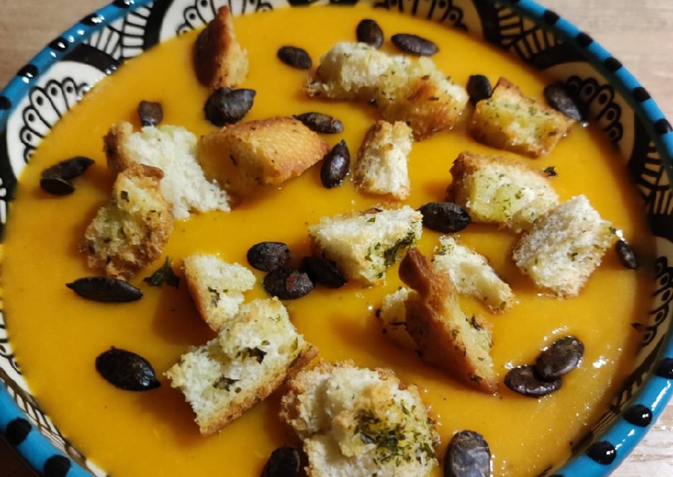 - Au four faites cuire sur une plaque quelques graines de courges et du pain de la veille coupé en morceaux un peu d'huile d'olive et de persil sur le croûtons avant cuisson