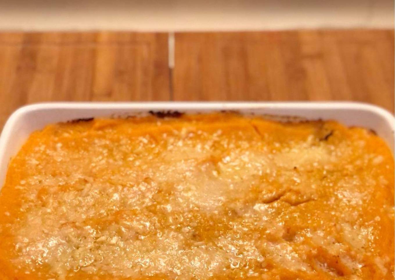 - Monter notre plat à lasagne avec une couche de lasagnes au fond du plat, 3/4 de la viande hachee au dessus, une seconde couche de lasagnes,le reste de la viande hachee et la crème au butternut. On y ajoute le gruyère et parmesan râpé et on cuit 35 minute à 180 degrés