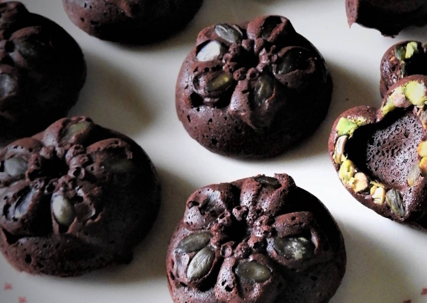 - Saupoudrer joliment le fond des moules de votre choix de pistaches et/ou de graines de courges et les remplir de pâte