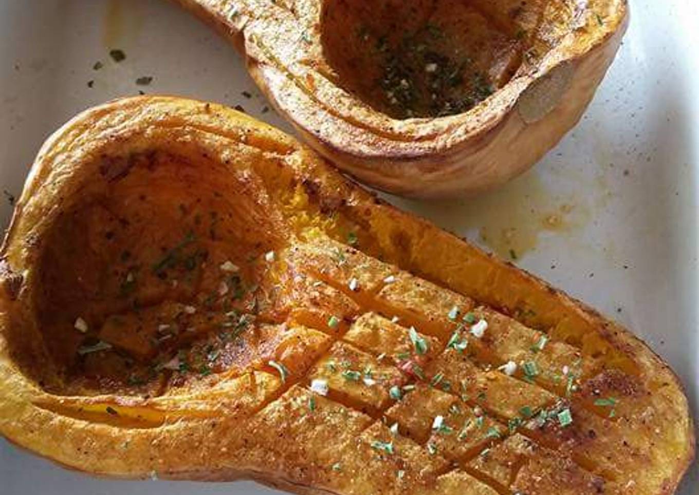 - Mettre dans un plat à four et enfourner dans un four à 200° pour 20 à 30 mn jusqu'à ce que la chair soit bien tendre. Arroser de temps en temps avec l'huile qui est dans le creux du butternut.