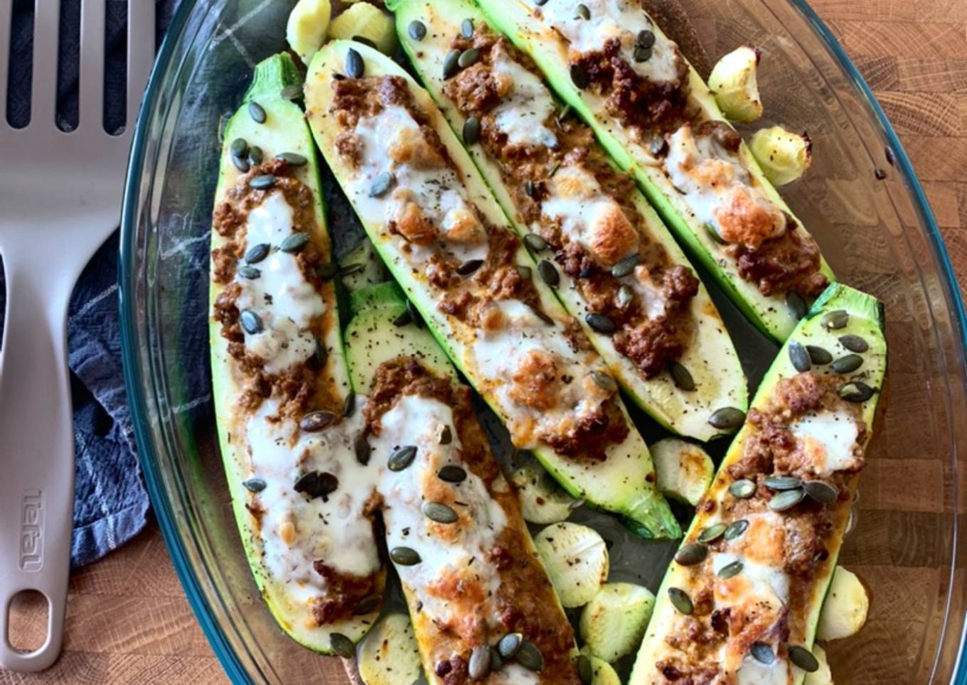 - Préparer la farce des courgettes : faire revenir l'oignon émincé dans une poêle avec l'huile et ajouter le boeuf. Assaisonner puis ajouter le pesto rosso, laisser mijoter quelques minutes