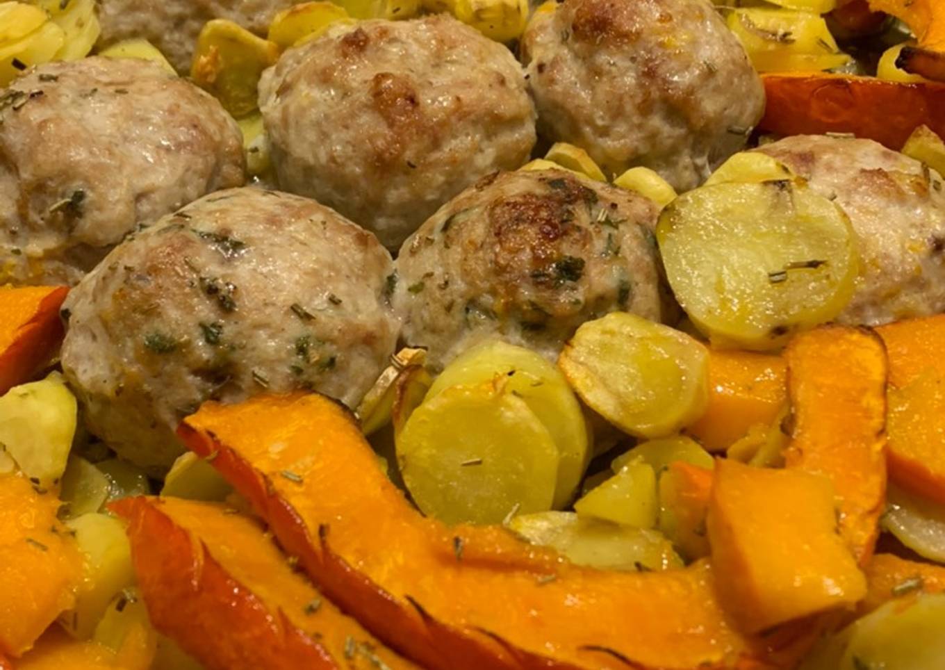 Boulettes de volaille, potimarron et grenailles au four