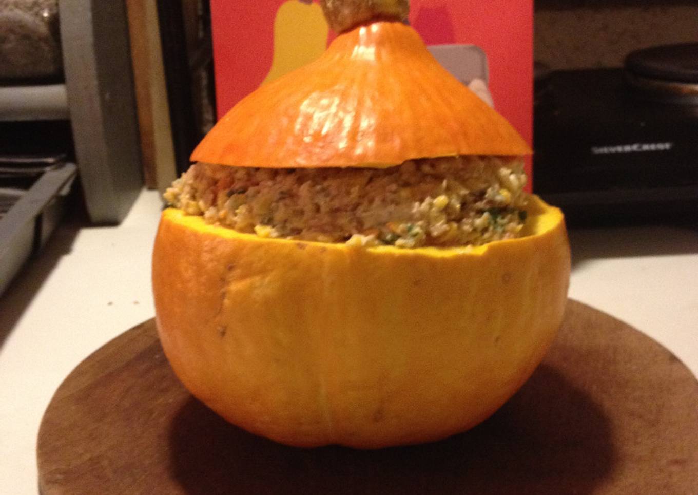 - Versez la farce dans le potimarron et remettez le "couvercle" de la courge
