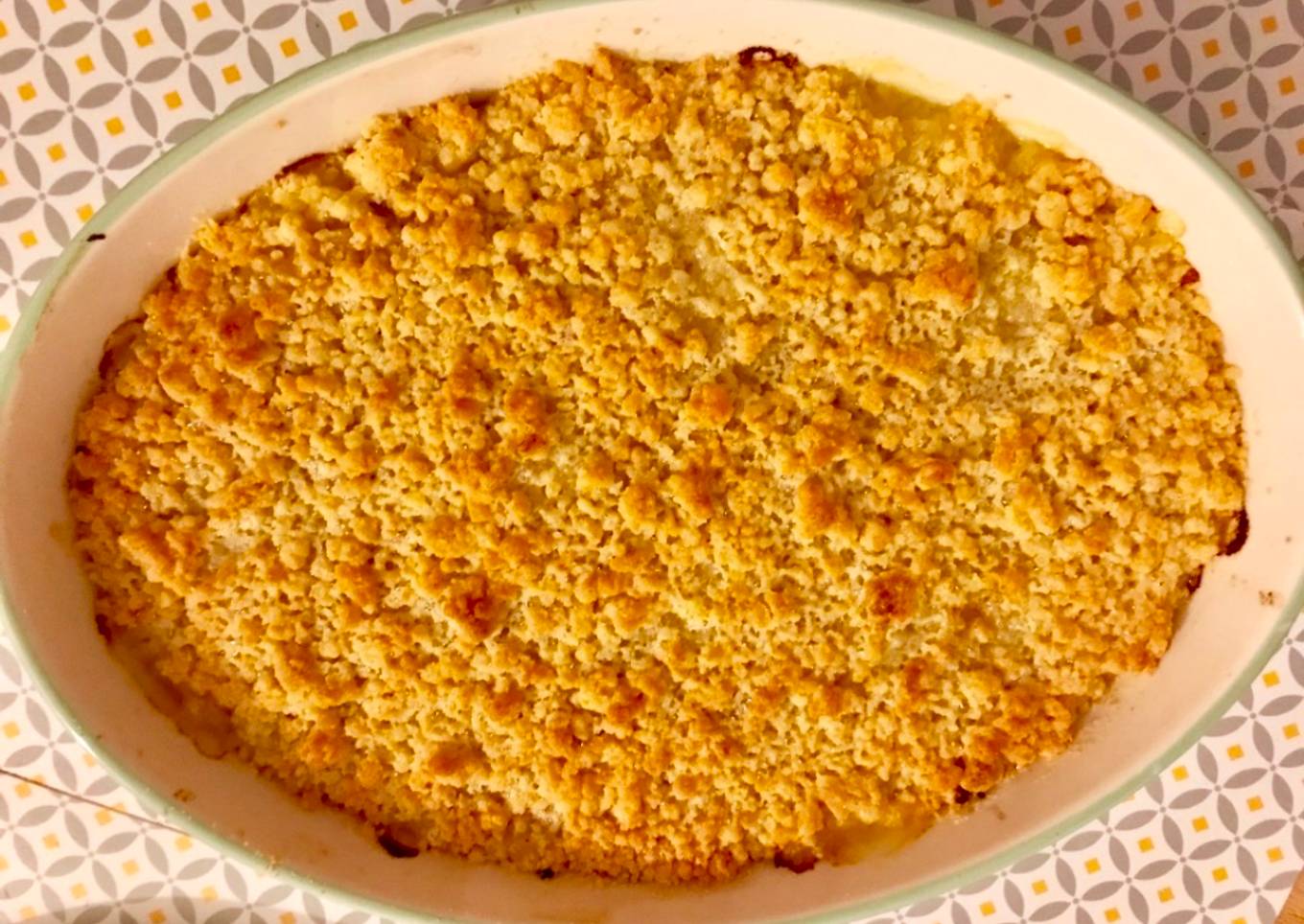 - Mettre le mélange dans des cassolettes ou un plat à gratin beuré. Puis recouvrir avec la pâte à crumble. Faites cuire 30min dans un four à 200degres.